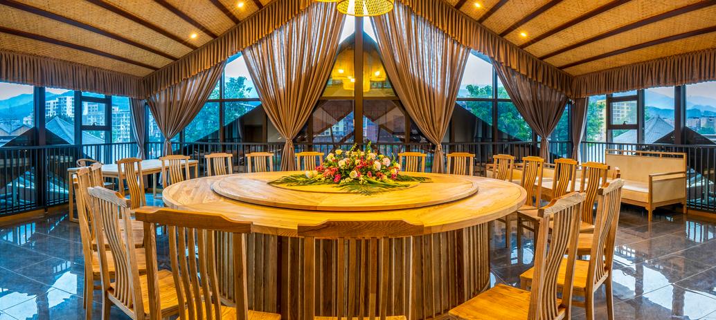 它的场景不仅优美生态,更清静宜人,在竹筏上、湖中央、树屋里、树林间、亭台中……都能吃火锅,同时还在湖中央设置了喷泉和舞台,夜晚的百荷园,灯光秀、舞台秀、喷泉秀交相呼应。